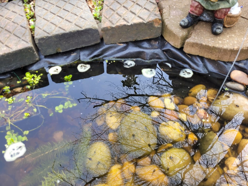At a loose end this morning, I remembered that I’d read about tadpoles liking cucumber. I checked out the details and read that you need to cut off the dark green outer skin and then float thin slices onto the water surface. So I ate the ones I’d already sliced, prepared a few slices properly and then headed down the garden to see what happened.