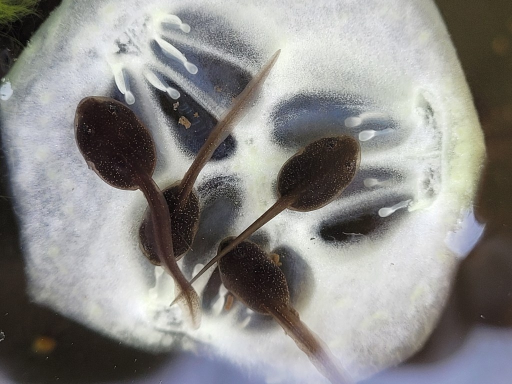 Where several tadpoles had latched on at one side, their tails acted like outboard motors and the cucumber slices were propelled across the pond like boats. Others looked like pontoons as more and more tadpoles swam on top. It was really cold and I hadn’t got a coat on but I couldn’t leave for ages, it was so much fun to watch.