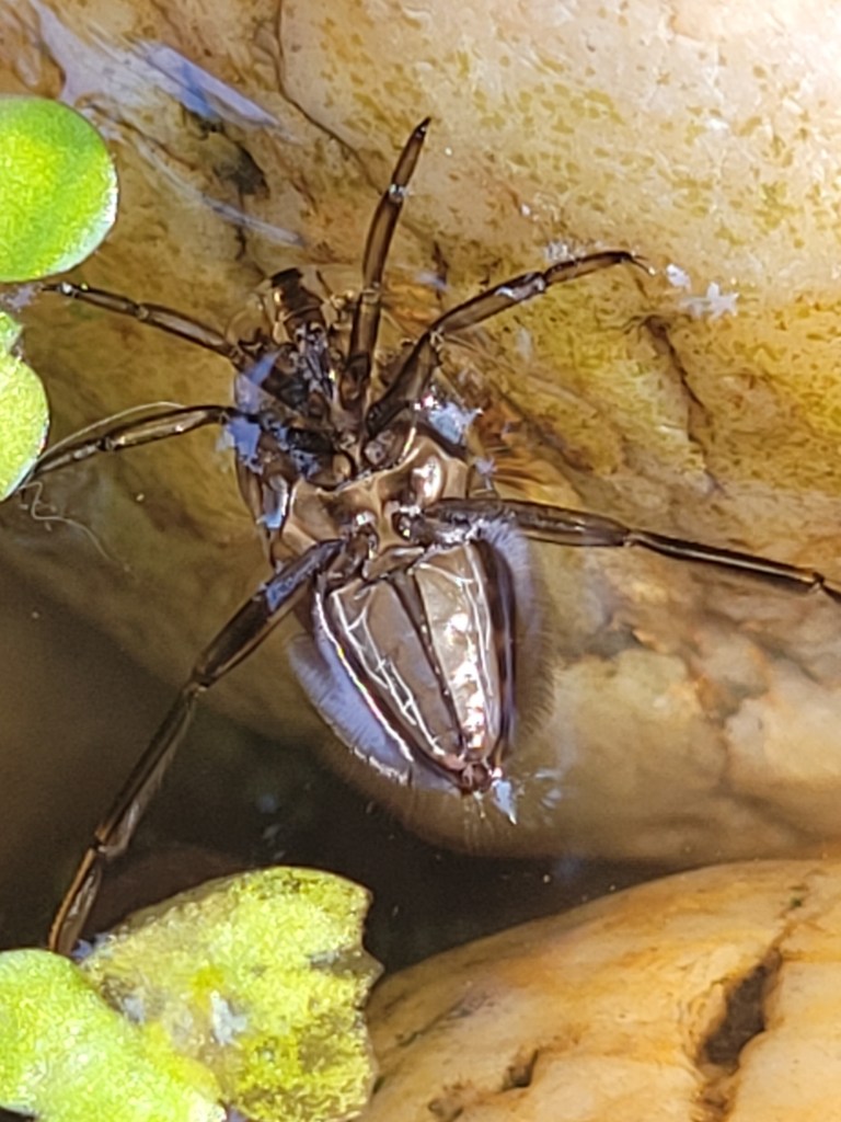 On the other hand, if I get close enough with my phone to record them doing something interesting, like jumping and scrabbling over pebbles, they stay very still and watchful, barely ever blinking (I saw one blink but wasn’t quick enough to record it). If they are facing me, they seem to stare me out until I give up. Given that I’m balancing on a stepping stone, trying not to tread on anything, with my arm stretched out to get close enough, I usually lose the contest.