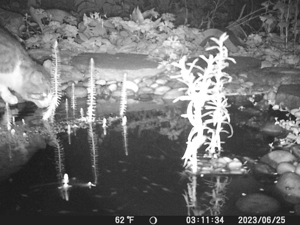 Victure HC300 Trail Camera: I set it up for the first time last night at dusk, mounted on a device John made to keep it steady, pointing slightly downwards towards one end of the pond. The camera takes pictures and video clips in colour until the light level is too low, then it records black and white footage and stills, using infrared. It’s battery-powered, so I set it to record for just 20 seconds each time it was activated.
