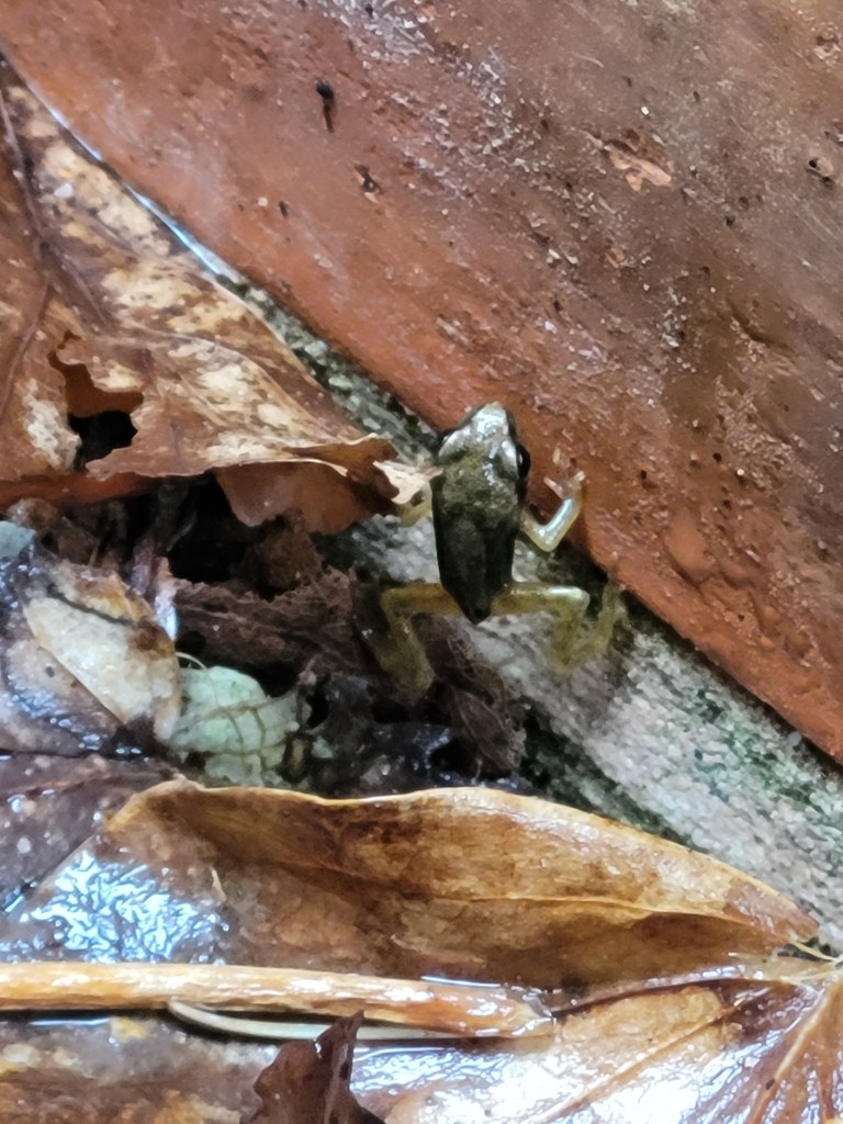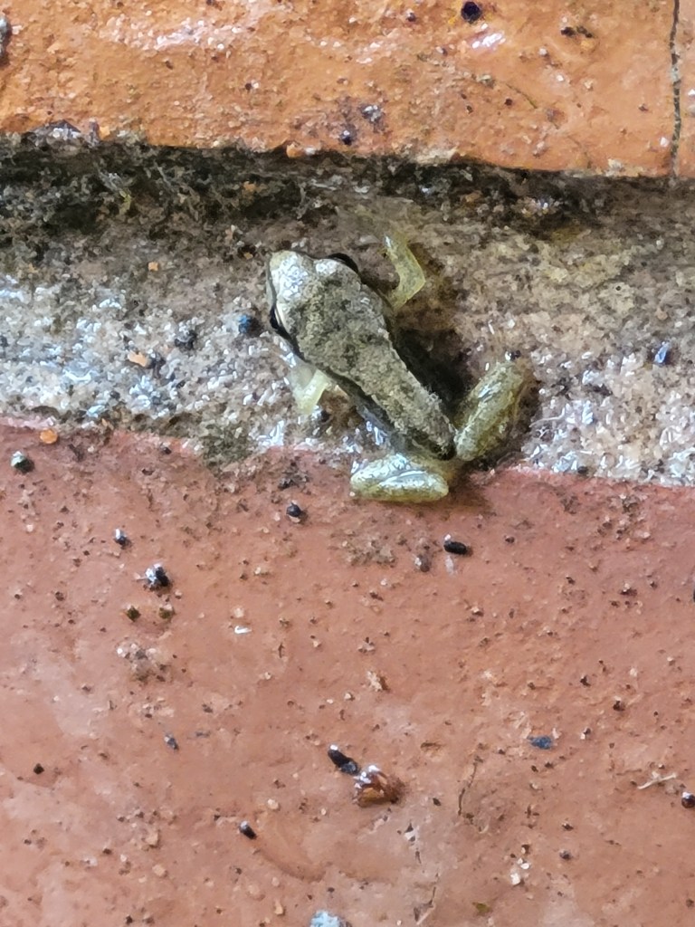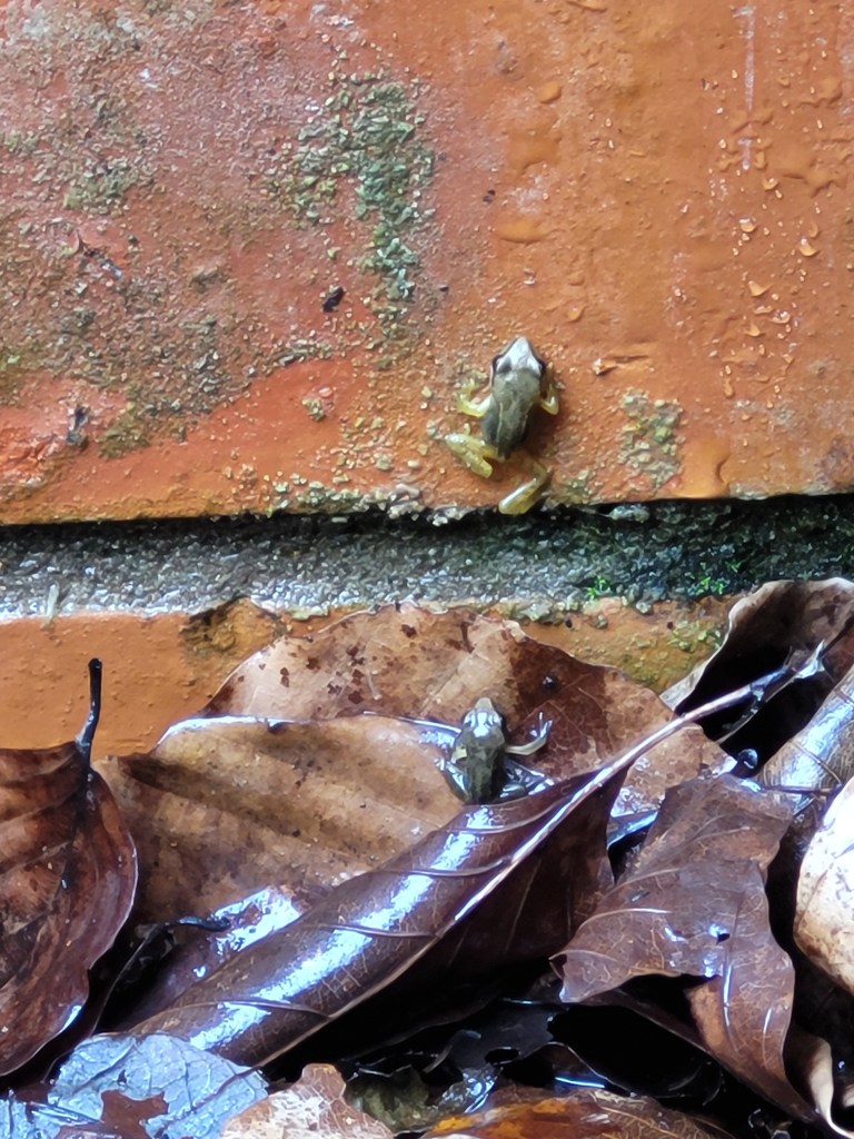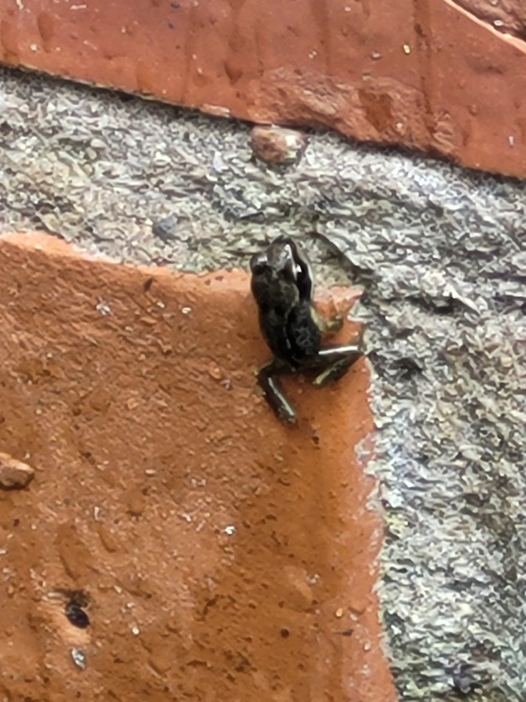 When I got back into the house, I Googled why do frogs climb walls when it’s raining? and I couldn’t find anything useful. So, if you know or have any ideas, please leave a comment. But it seems the rain has this effect. After the rain stopped, I went out again. Earlier I saw lots of froglets clinging and climbing and quite a few hopping out of my way in all sorts of places. This time… nothing. All quiet again. Hmm.