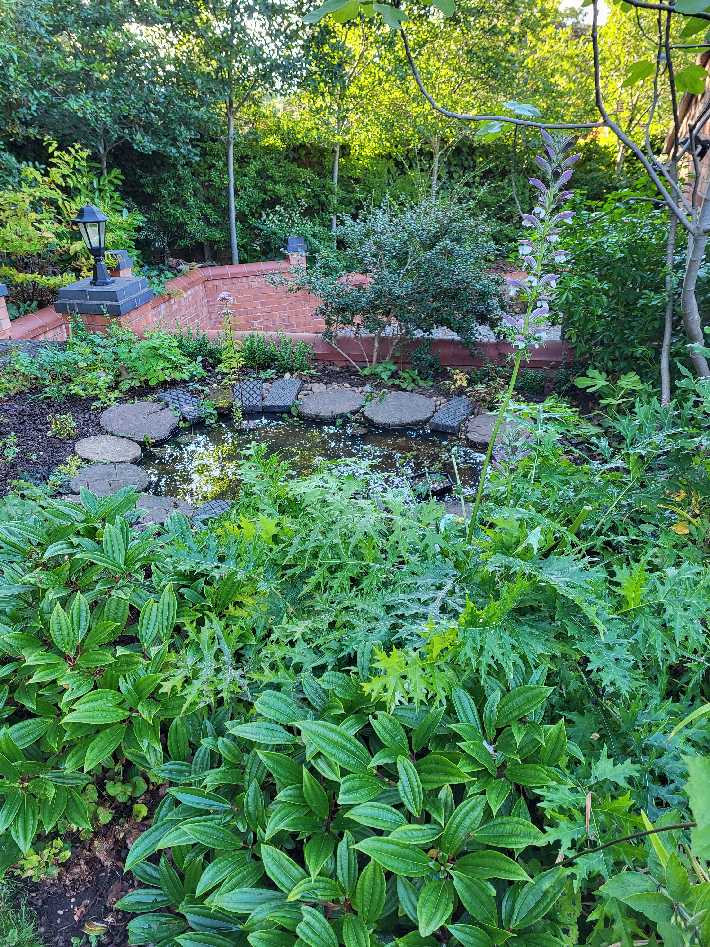 I used an E-Best-Offer pond liner size 2.5m x 2.5m from Amazon at £12.99 and one bag of horticultural washed gravel at £4.99 from Smiths Garden Centre, Baginton (a local family run business) I should have washed it again before adding to the pond though because my first pond fill was a brown puddle. I reused the stepping stones I’d used before to cover the liner and it looks like it was always there.