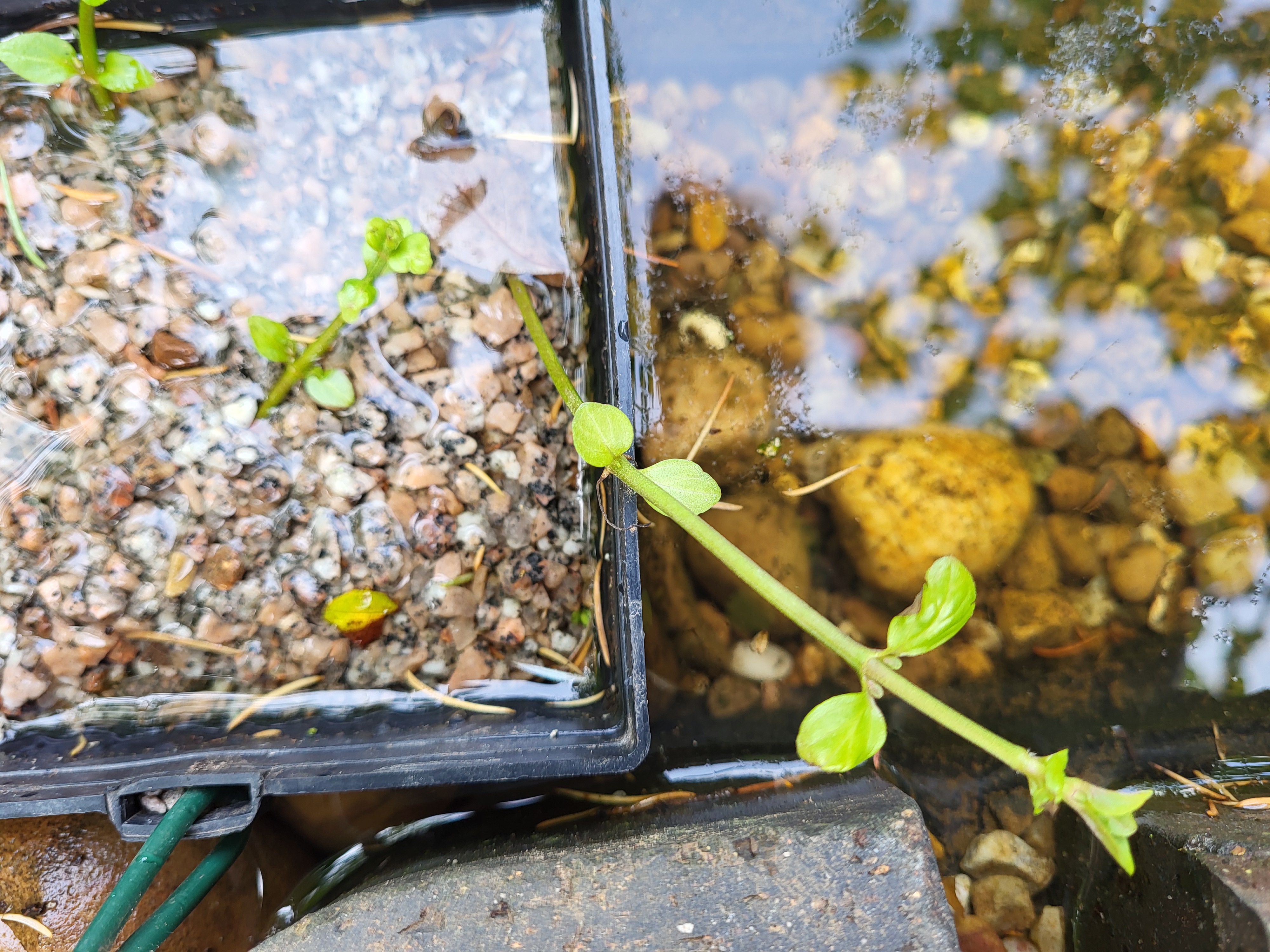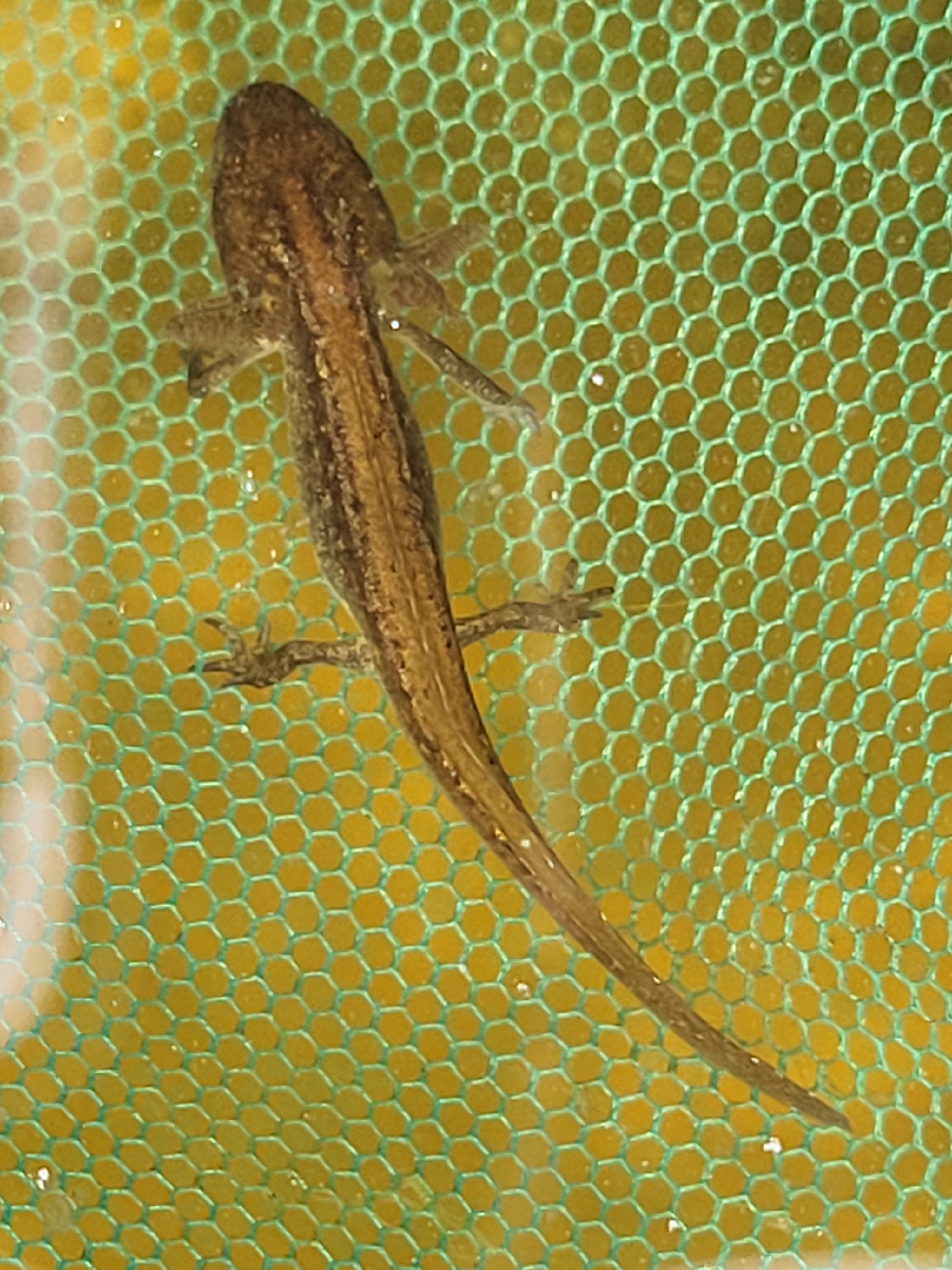 For the last few days, I’ve looked for the two frogs in the yard and found nothing but slugs and beetles in the usual places. Disappointed, I decided to give up looking and just hope they survive to produce tadpoles next spring (assuming they are not both males or females of course). And, giving myself something to do instead, I focused on adding plants to the now crystal clear water of the reinstated old pond and checking up on the newts in the new pond, using my new nets.