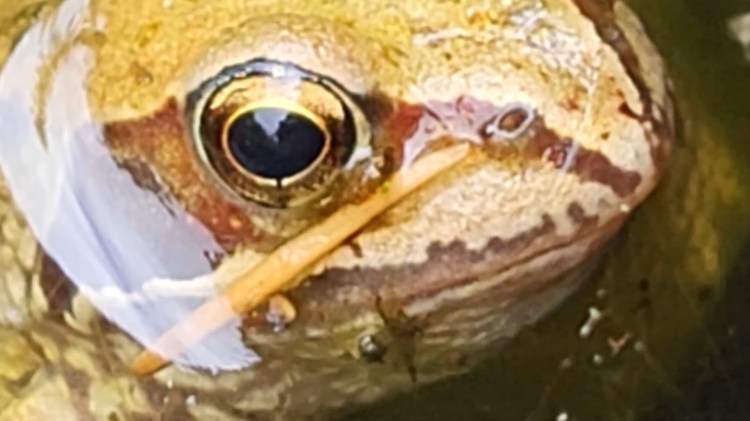 My final though for today is that these two frogs may not have grown from my tadpoles at all, but are likely to have travelled from local damp areas that have dried up or have too much competition for limited food sources. It’s puzzling that I had loads of froglets and tiny frogs, then a few this spring that seemed to have grown quite a bit. Then suddenly no sight of the smaller frogs and these two big ones appear. Suspicious?