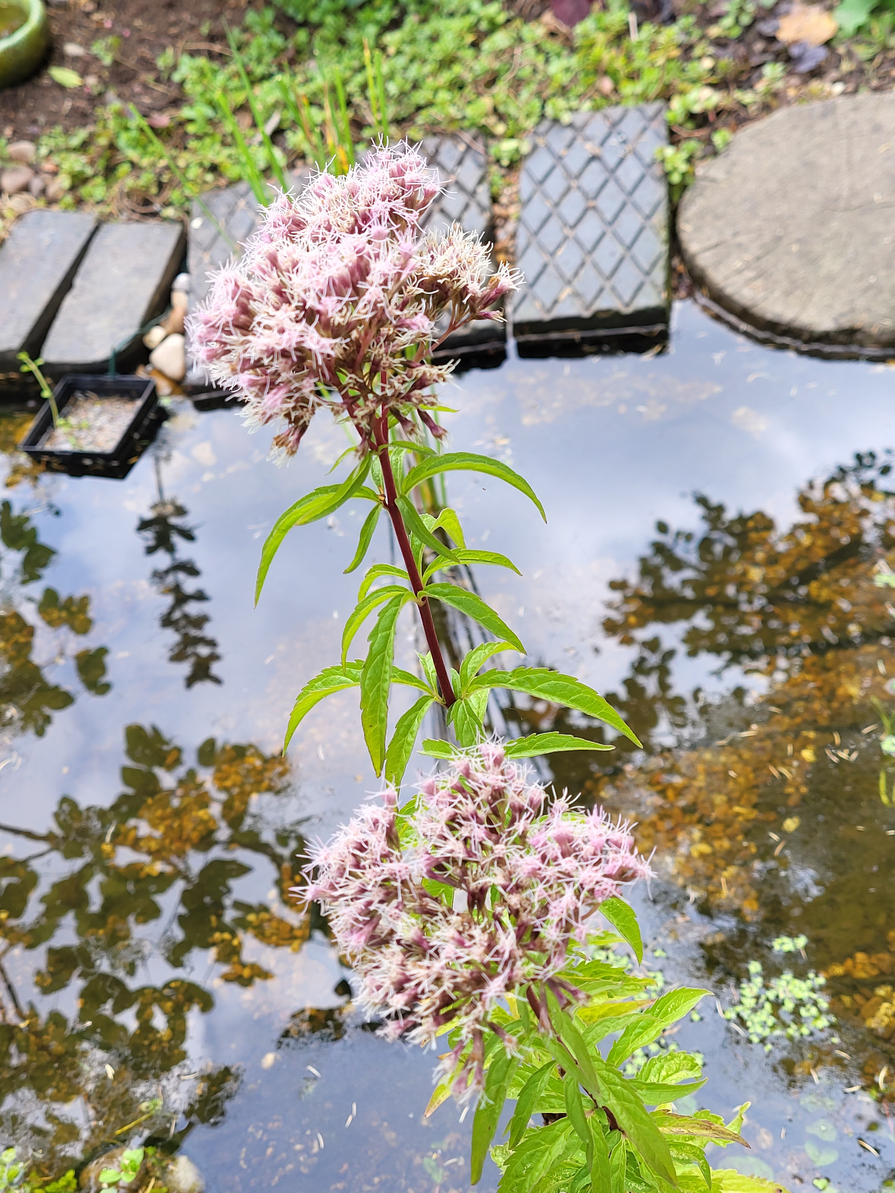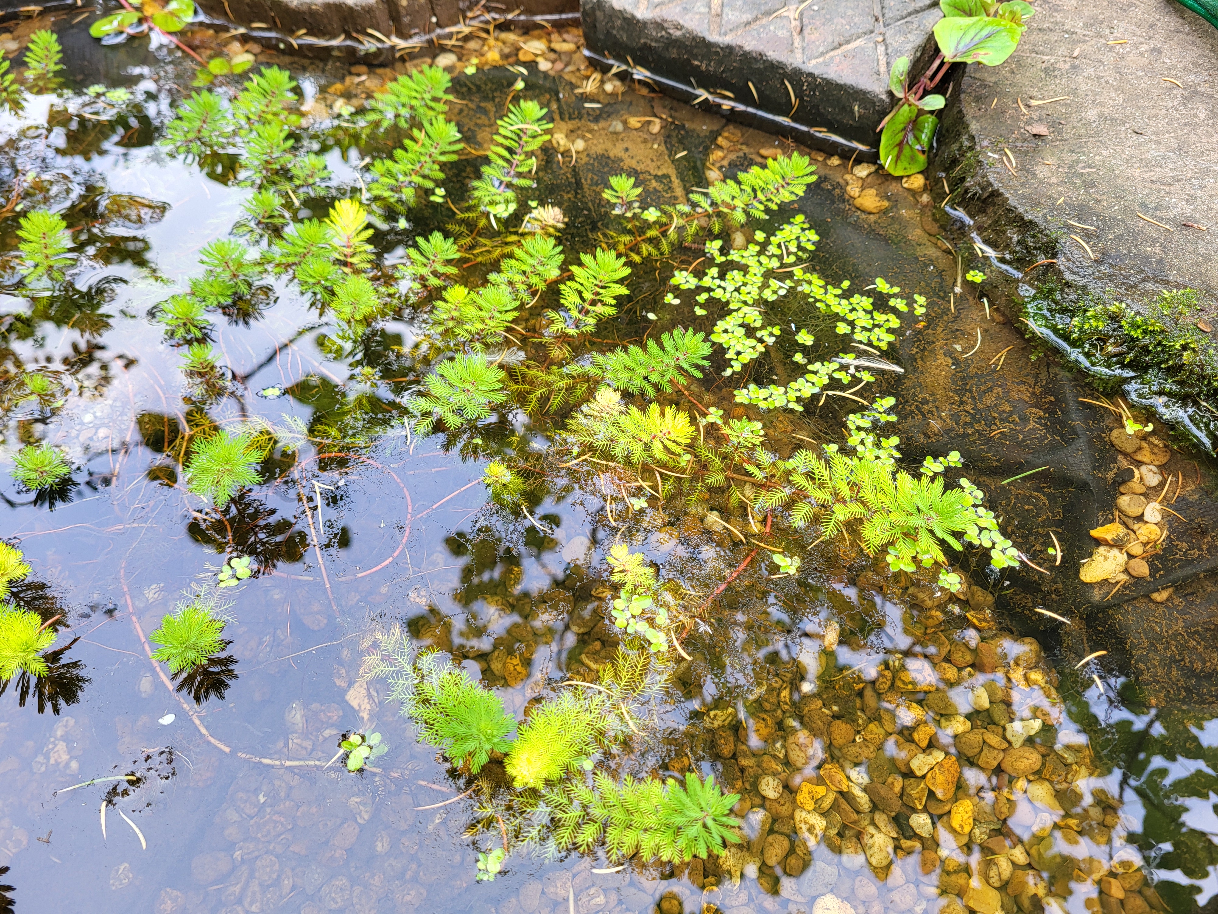 The pictures above show plants and cuttings from: 1) Eupatorium cannabinum (Hemp agrimony) with delicate fluffy pale lilac flowers standing tall above the water. 2) Calla palustris (Bog arum), a spreading plant which can be pollinated by snails. 3) Lysmachia ‘Sunburst’ saved from the original pond and now gently drifting into the water from among the stepping stones in several places. 4) Myriophyllum red stem (Parrot’s Feather) which floats delicately on the water surface and providing shade for pond life. I have also put in a few cuttings from existing plants. I’m not sure what they all are but I definitely included 5) Hippuris vulgaris (Mare’s Tail) which rises out of the water like wire bottle brushes and 6) Mentha aquatica (Water mint) which is irresistible. I can’t visit the pond without brushing my fingers against it for the lovely minty smell.