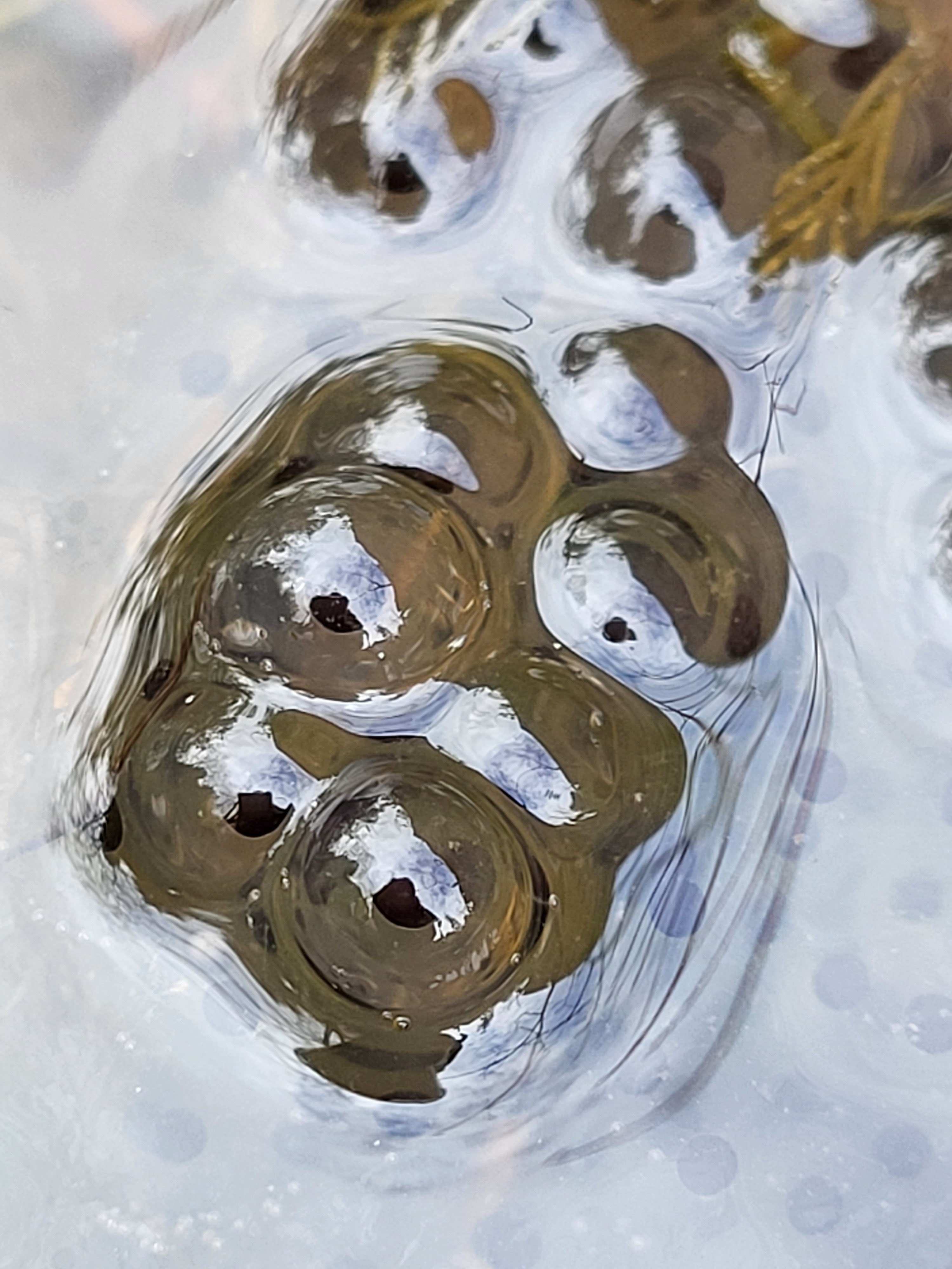And just to finish, here’s a shot of the latest clump of spawn emerging from the pond surface. It looks like a weird pudding with cream, due to light reflection on the water.