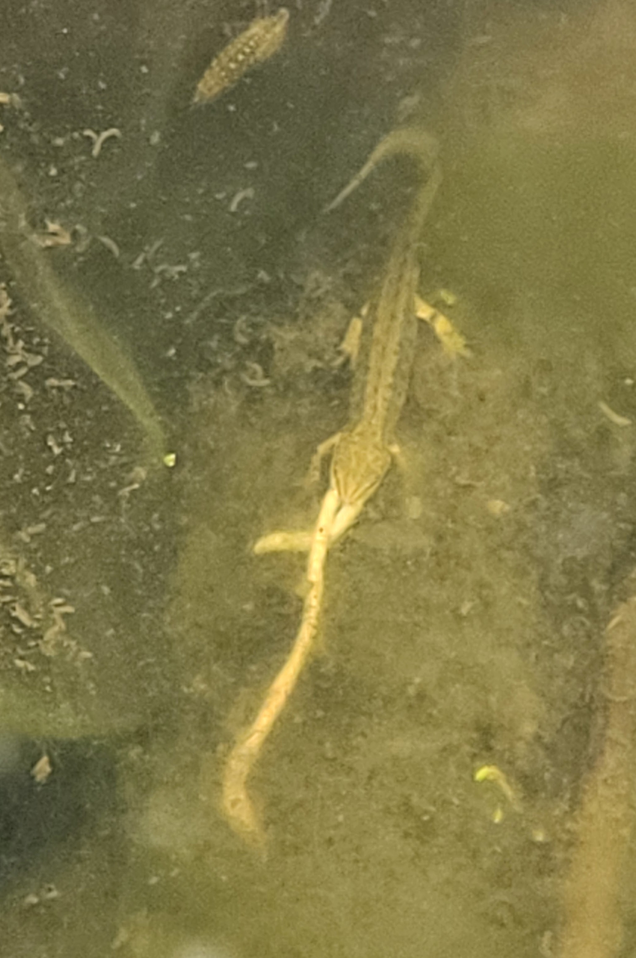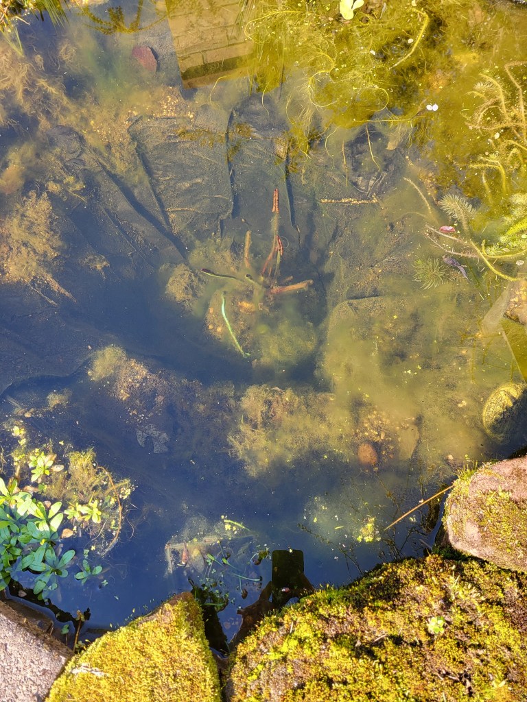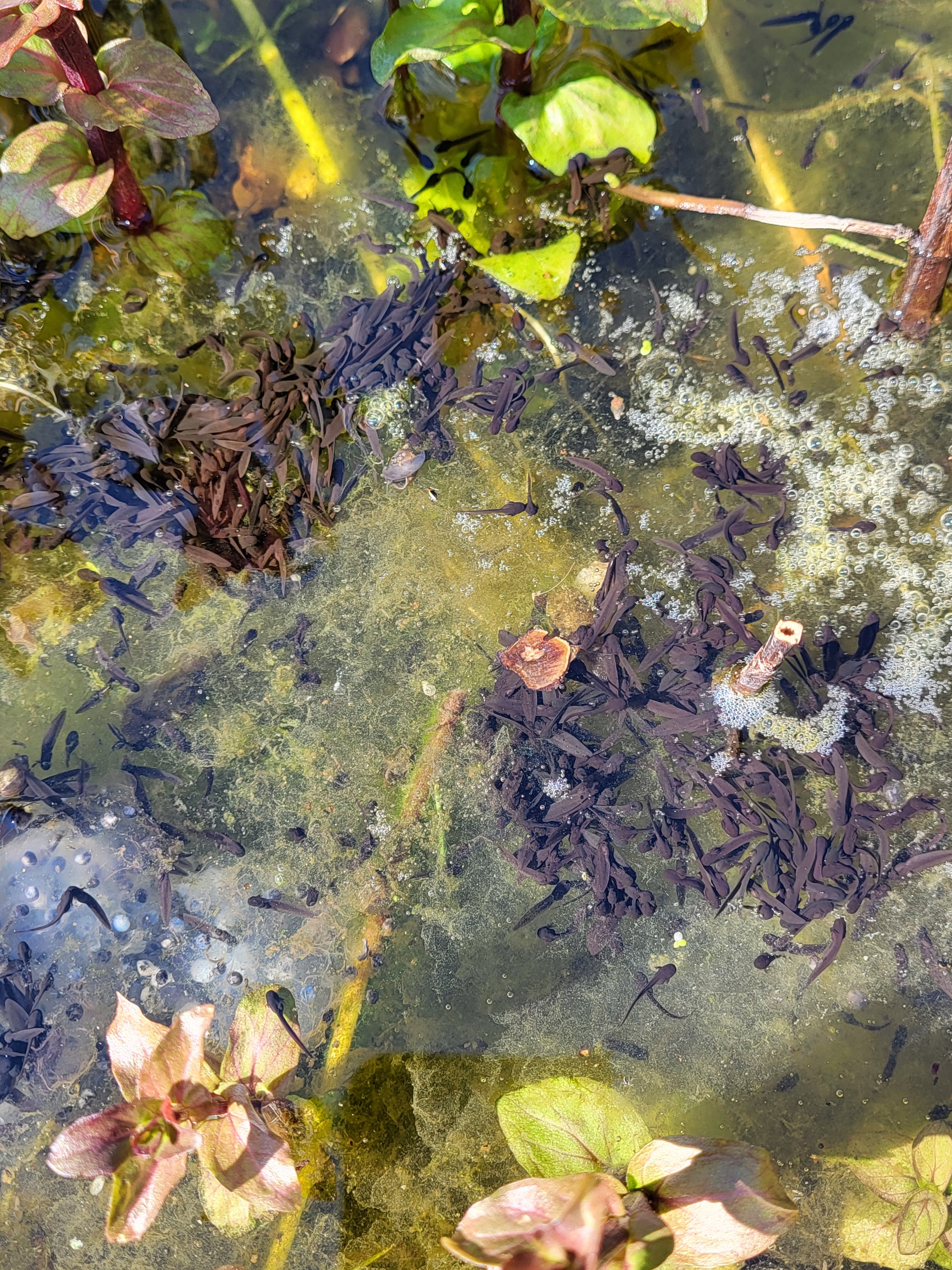 And, in the ponds, I saw that the tadpoles had escaped their spawn blobs and were huddled together feasting. Most were still wriggling but some had escaped fully and were swimming free of the spawn clump. If you look closely you will also see mating pond snails in one of the clips.