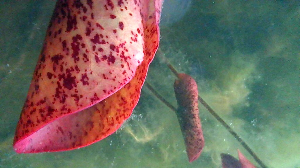 Today, I checked on the tadpoles and thought it was interesting how leaves and seedheads can provide a structure for a video clip. The colourful half-eaten leaf provides a shelter and the seeds are completely ignored as the tadpoles go about their business.