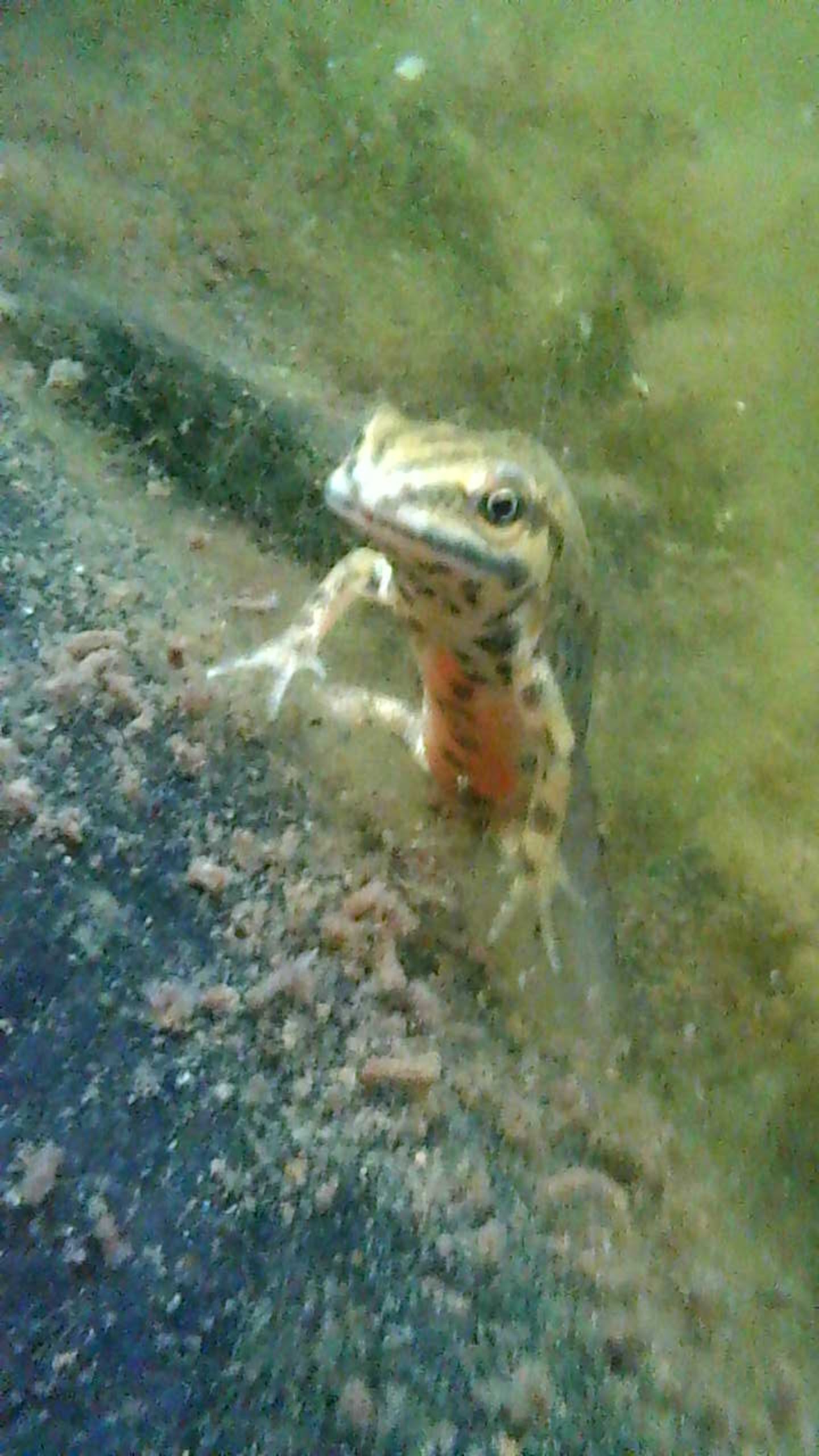 As there was a lot of underwater activity, I decided to use my endoscope today, to see if I could get a look at the newt underbelly. They look so different underneath, although you do get a hint of it in the neon-coloured blue and red flashes at the end of the tail. Newts remain fairly dull brown colours on their backs, for camouflage, while their underside is bright red or orange. This acts as an ‘I’m poisonous’ deterrent for predators but also as an ‘I’m here’ signal during the mating season.