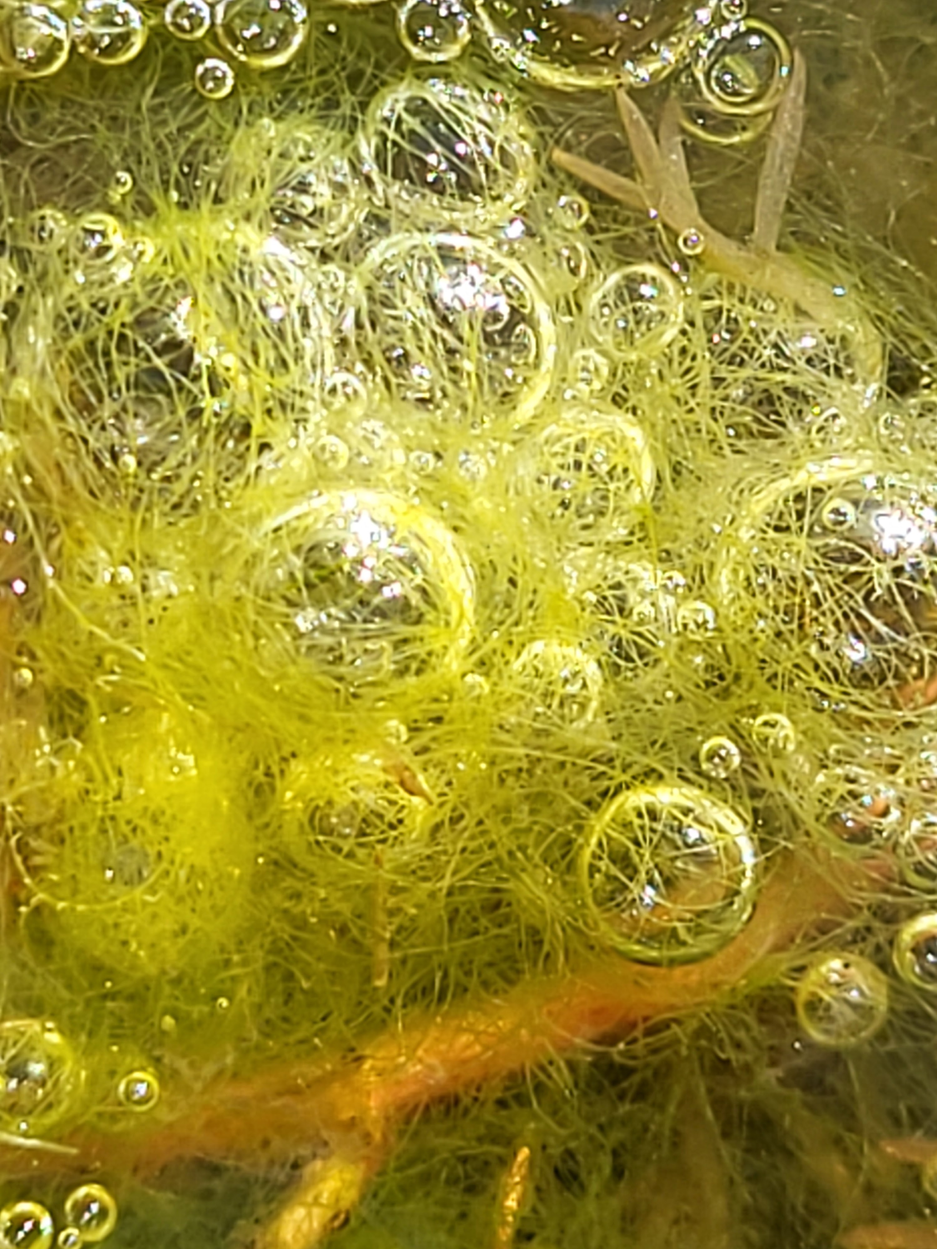 Here you can see the bubbles from decomposing spawn jelly and algae. And you can also make out clumps of tadpoles next to spawn that is still developing.