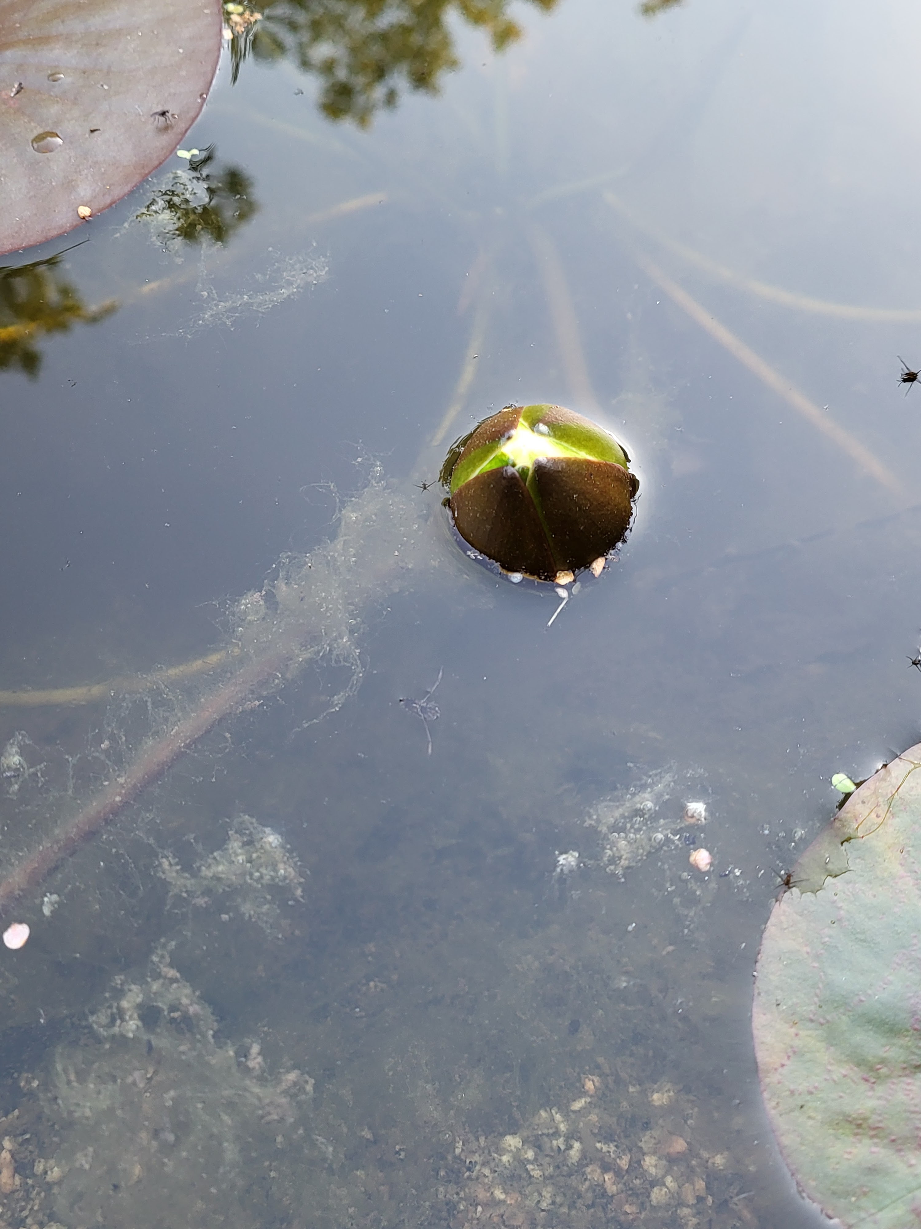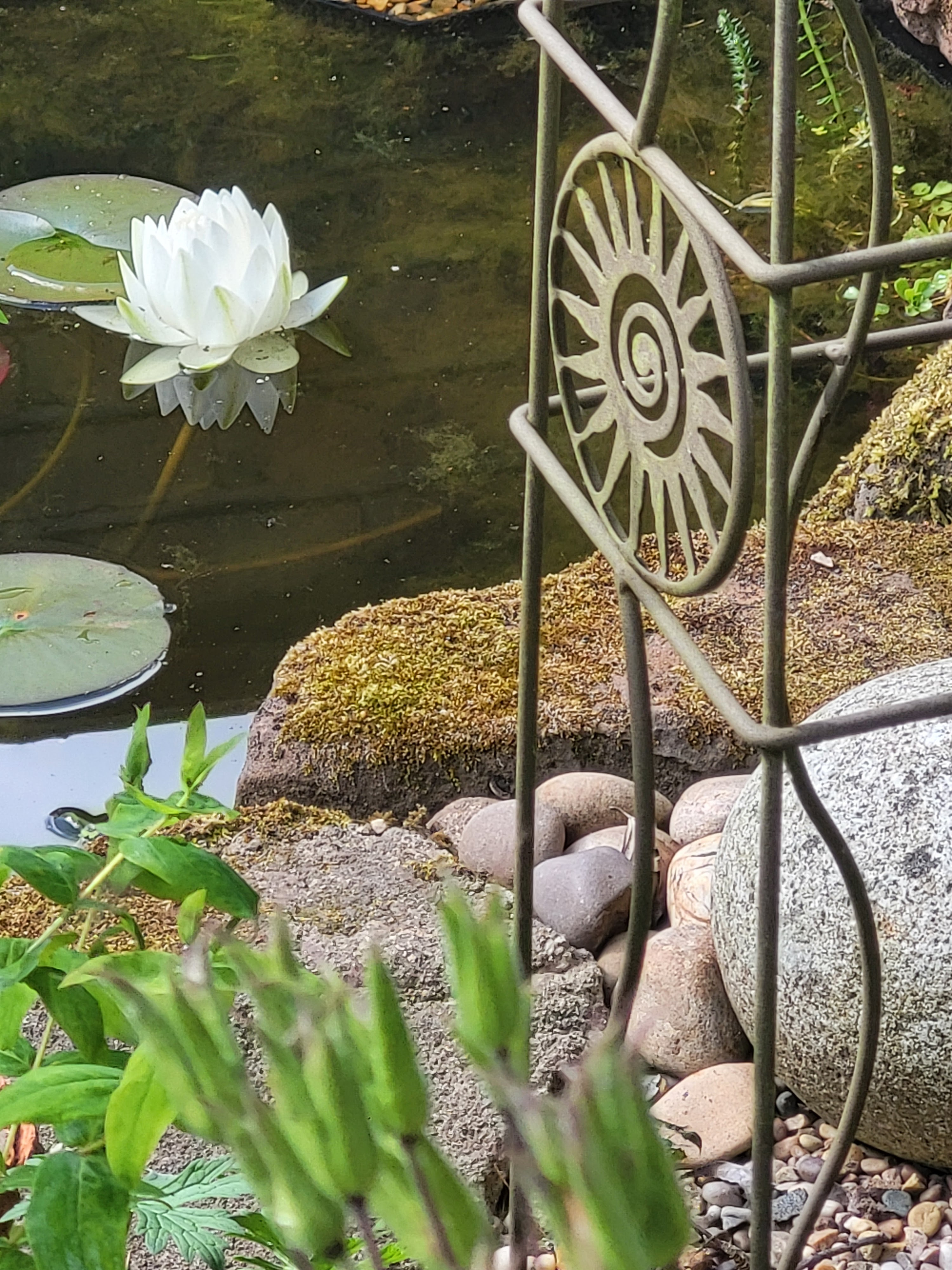 We’ve been away for a few days and, unexpectedly, it’s been sunny and warm at last. The waterlily was just emerging when we left and is now in full bloom for the first time, with a second bud just breaking the surface.