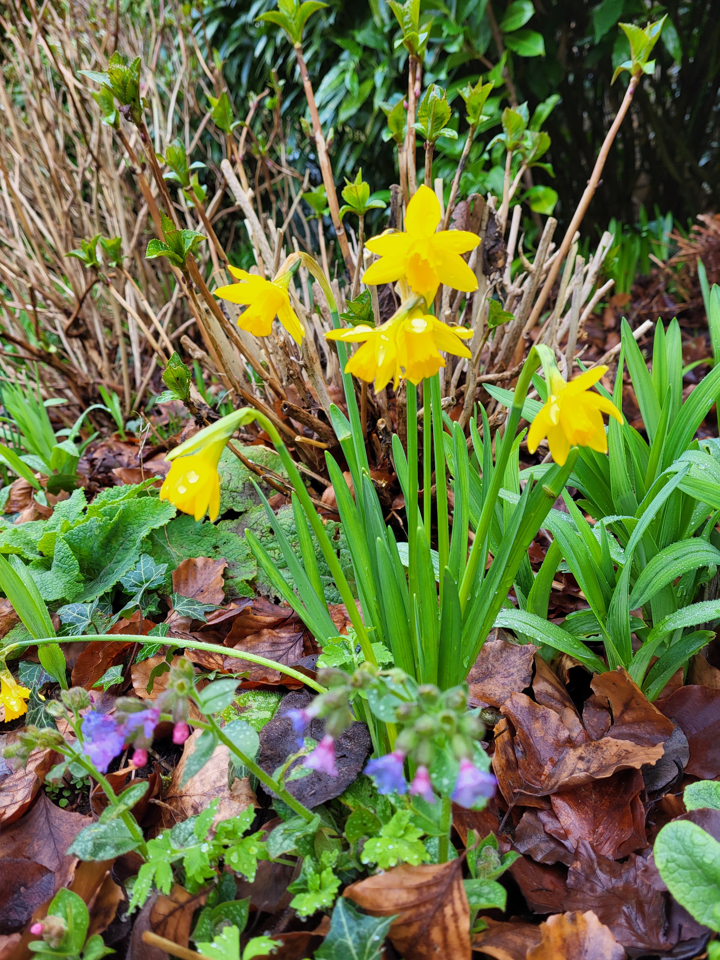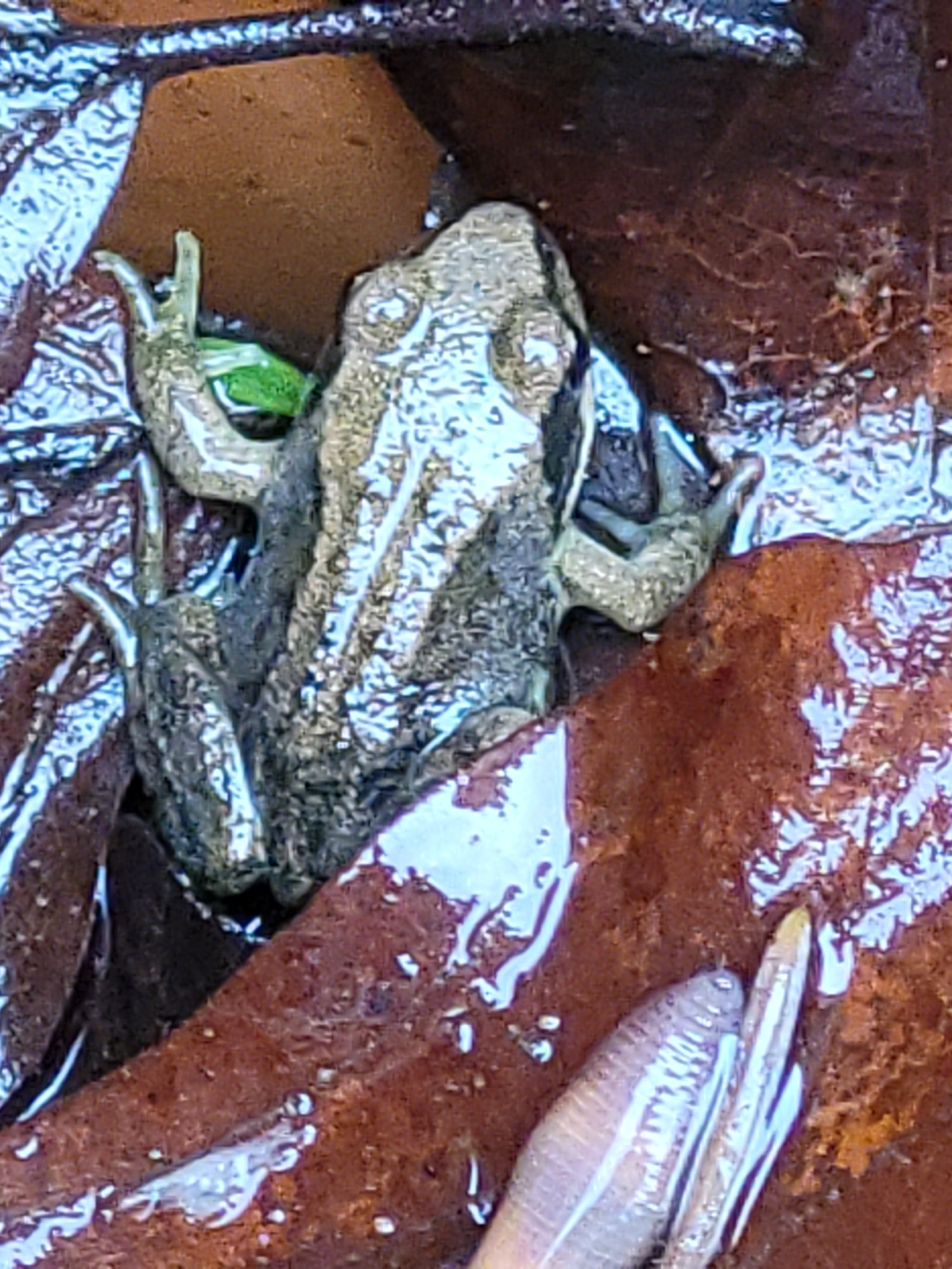 Apart from a few days, it’s been too wet to do any gardening but good weather for frogs of course! Although it’s been quiet in the undergrowth, I’m hopeful that enough have survived the winter to start their job as slug-repellers this season. Today, I borrowed a couple of bricks from the yard to block a gap where rabbits are getting in. Lifting a brick, I disturbed six little frogs. Here’s one that didn’t immediately get away.