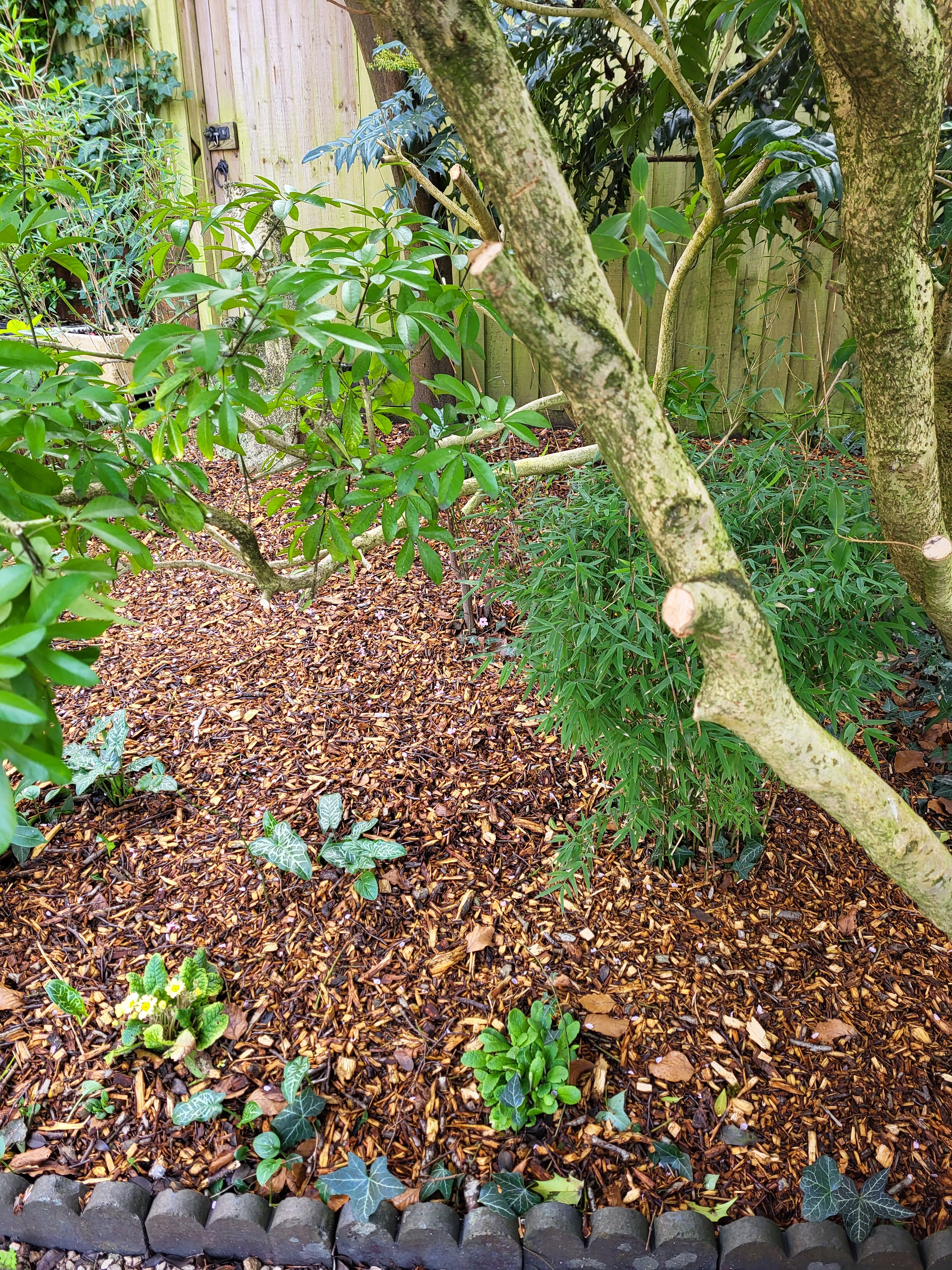 The tree surgeons arrived in January and did a great job on the Beech and another tree overhanging our yard. We now have a big pile of logs to be sawn into smaller pieces. They also left us the wood chippings. I donated a few bags to friends and family and then let it rest for a while because I’m told it takes up nitrogen from the soil if used to quickly. Last weekend I shifted a builder’s bag of it and mulched a shady area of the garden.
